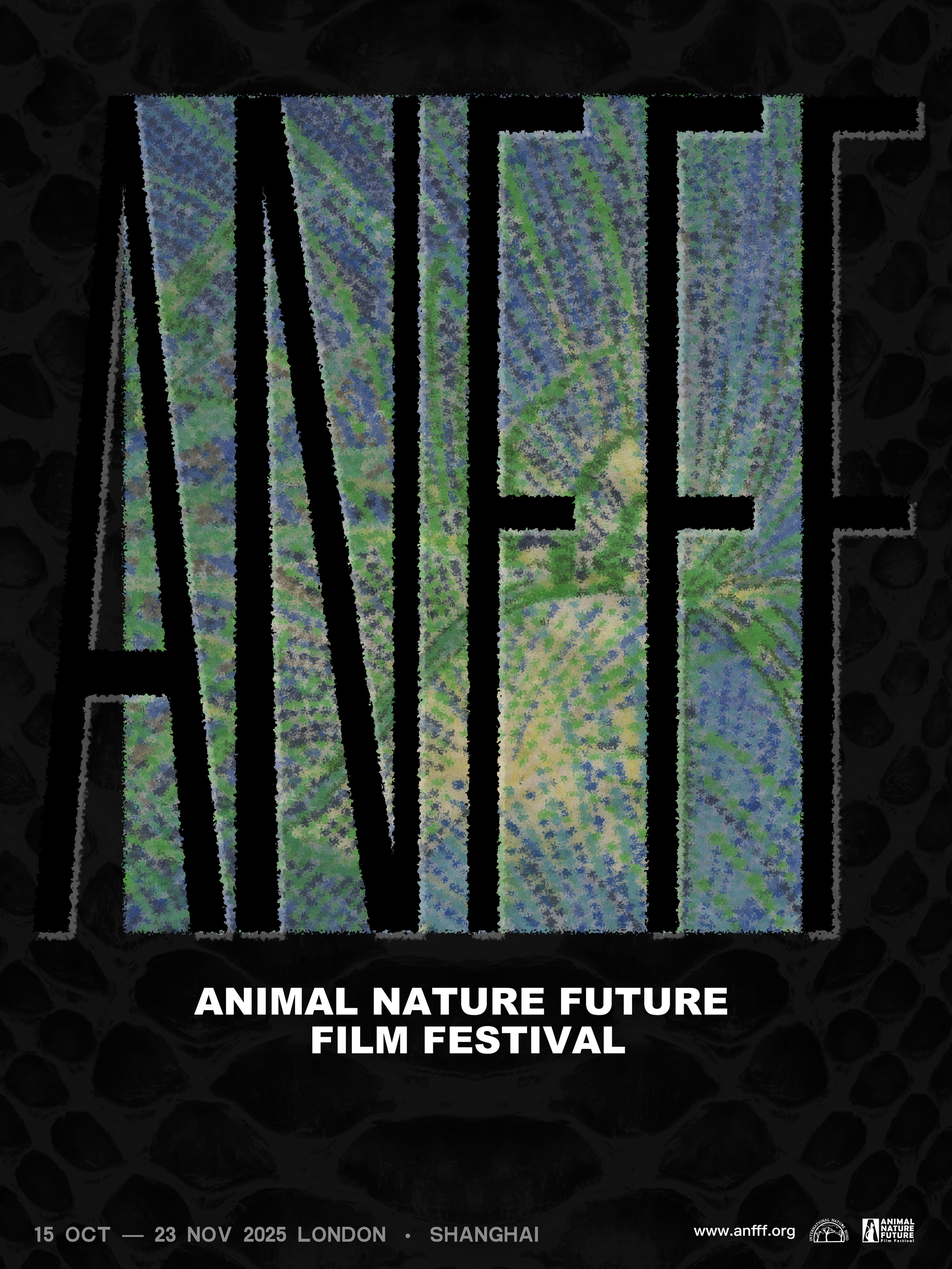 This year's key visual begins with a door, slowly opening to an unseen world. Snake-scale textures and ruin-like fragments evoke hidden energy, time, and memory. At the centre, deep green and the railing-like #ANFFF suggest both restraint and surging vitality. The poster becomes an experimental vision of how the future ecology may be reimagined.